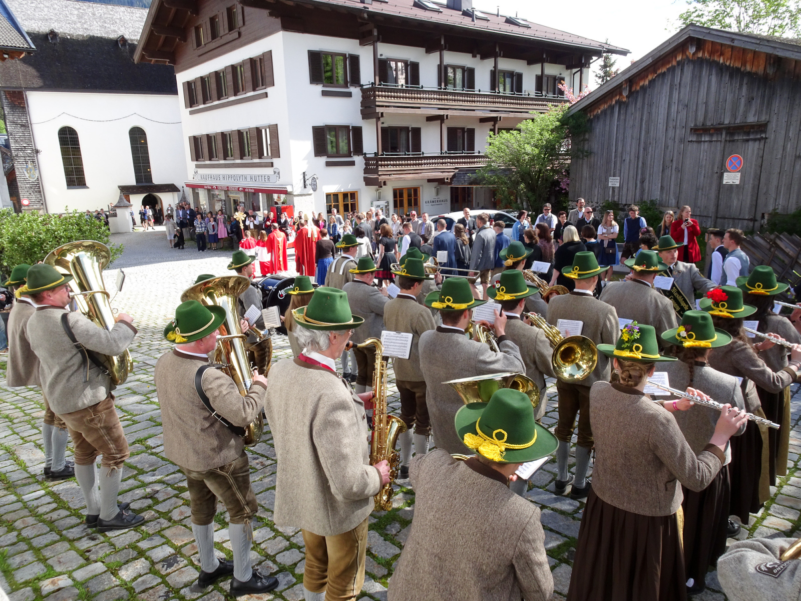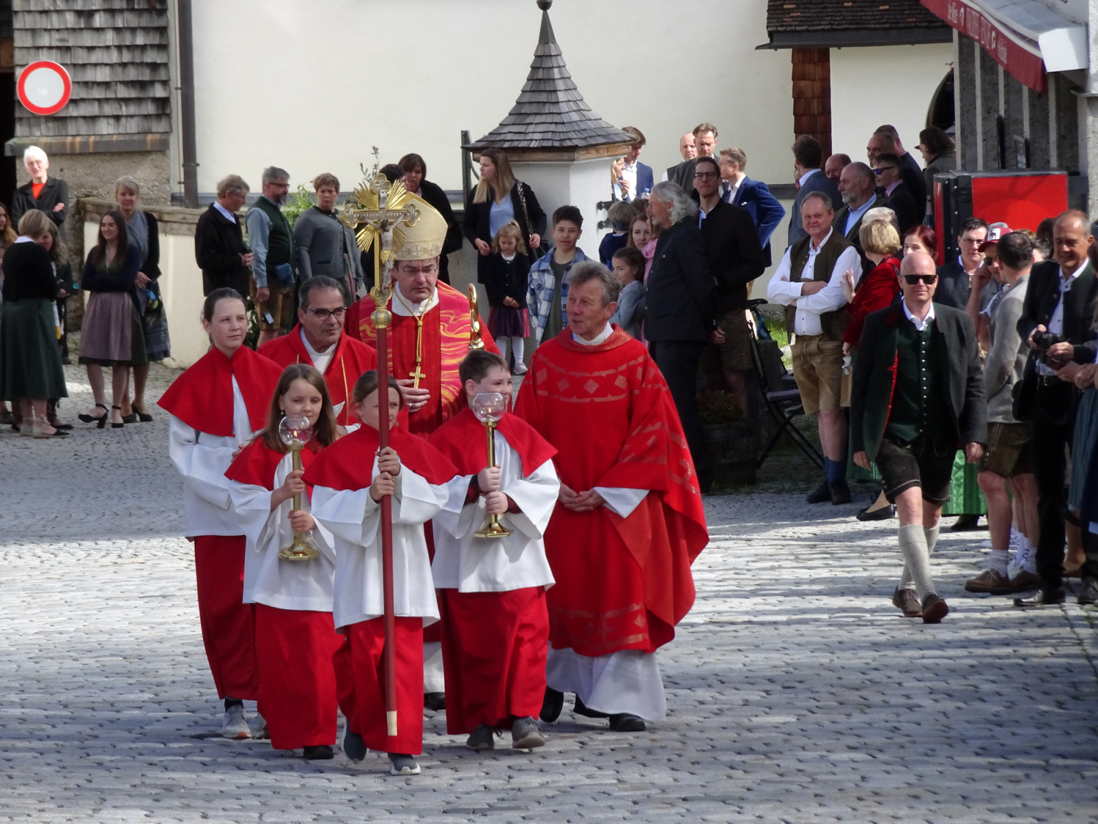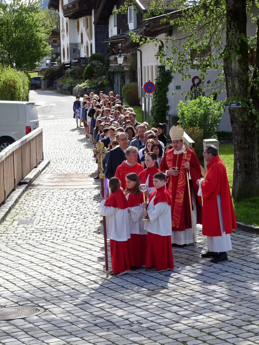 Samstag, 13. Mai um 10 Uhr: bei heiterem Himmel und begleitet von den festlichen Klängen der Musikkapelle Leogang werden die Firmlinge und deren Paten vom Firmspender Prälat Eduard Fischnaller, Abt von Neustift in Südtirol, Pfarrer Franz und Diakon Ludwig vor dem Pfarrhof abgeholt und in die Pfarrkirche begleitet, um dort das Sakrament der Firmung zu empfangen.