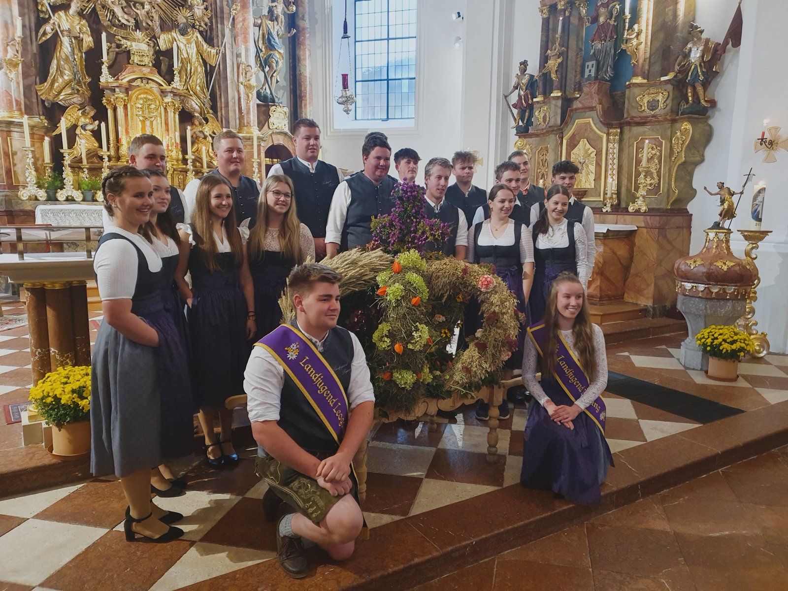 Unter einem grauen Himmel – aber immerhin trocken – trafen sich die Landjugend Leogang, die Vereinsabordnungen und die von einer großen Schar Ministranten begleitete Geistlichkeit bei der Leonhardikapelle, um die prächtige Erntekrone zu bewundern, zu segnen und sie unter den Klängen der Musikkapelle Leogang in die Pfarrkirche zu tragen.